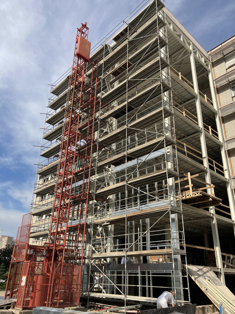 Z důvodů zjednodušení zakládání a rychlosti realizace byla zvolena technologie kombinující primární montovaný skelet z válcované oceli (HEB profily), s podlahou tvořenou vysokým trapézovým plechem s nadbetonávkou a následně doplněný výplňovými stěnovými moduly s konstrukcí z tenkostěnných ocelových profilů tvaru C a U, které jsou do primární skeletu vkládány. Výplňové stěnové moduly jsou sestaveny ze stojek šířky 120 mm (150 mm u podlaží s vyšší výškou) se základní roztečí 625 mm pro přímou montáž vnějších i vnitřních desek fermacell®, které zajistily spolu s vloženou minerální vatou protipožární odolnost skladby a vytvořily čistý vnější povrch pro montáž provětrávané fasády z bondových panelů. Konstrukce výplňových stěnových modulů byla na spodní straně kotvena vždy do betonové desky hrubé podlahy, na horní straně pak přímo nastřelením do vodorovných HEB profilů primárního skeletu.