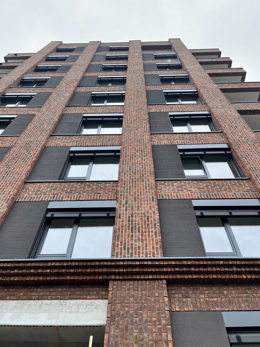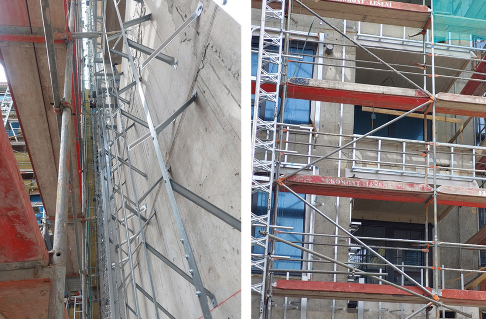 „Technickou výzvou bylo zhotovení říms u výškových domů, které měly z estetického hlediska napodobovat římsu starých továrních cihlových komínů – uvedené římsy byly několikrát odskočeny a jejich dílčí výšky odskoků byly přesně stanoveny na výšku či délku klinkrových obkladů. Předsazení římsy zasahovalo do fasádního lešení pro zhotovení celé fasády domů, a proto bylo nutno upravit konstrukci Diagonal 2H tak, aby bylo možné po demontáži lešení pouze doplnit rastr a obklad deskami fermacell® Powerpanel H2O a to pouze v místech stojek fasádního lešení.“