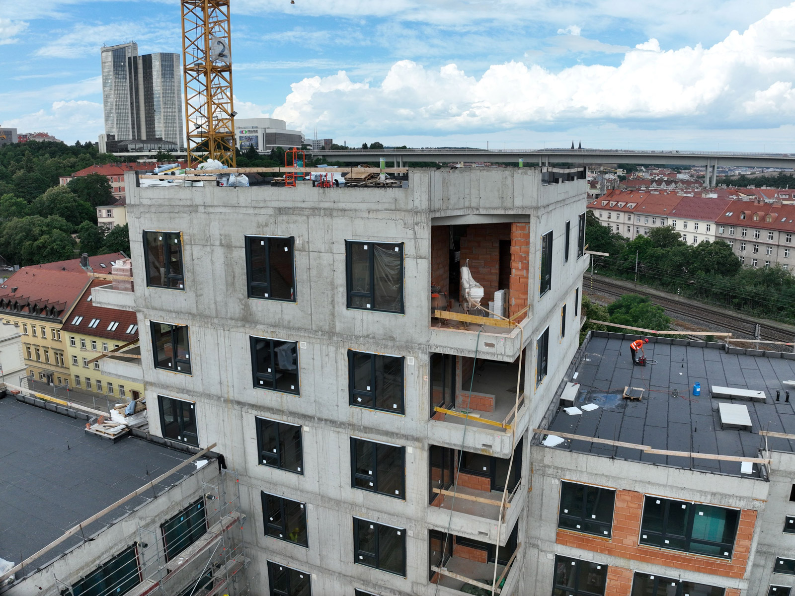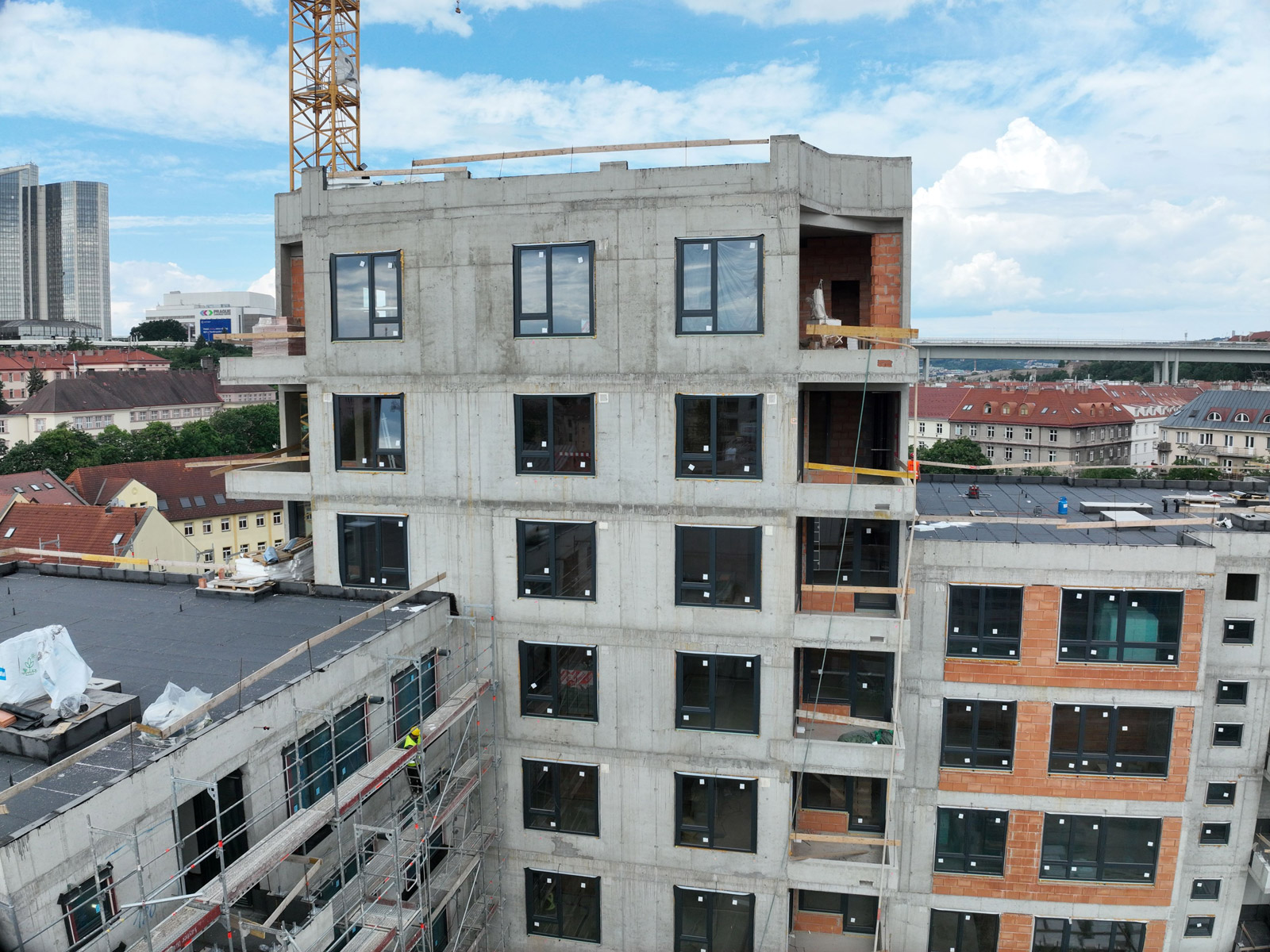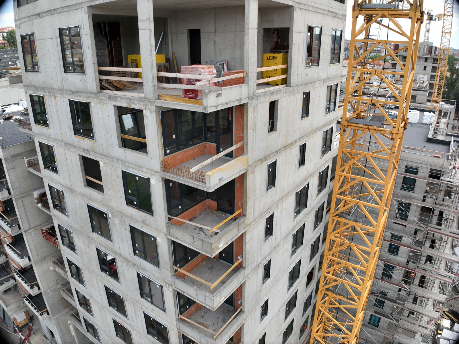 „Při realizaci takto vysokých domů bylo nejdůležitější vyměřit základní horizontální a vertikální osy, a to z důvodu, aby okna byla ve správné vzdálenosti od svislých vystouplých části domů (které navozují charakter sloupů) a aby vodorovné dilatace provětrávané fasády byly provedeny ve správné výšce s ohledem na skladby obkladů z klinkeru a okenních parapetů,“ říká jednatel společnosti Inter Gips, s.r.o. Ing. Petr Pume a dodává: