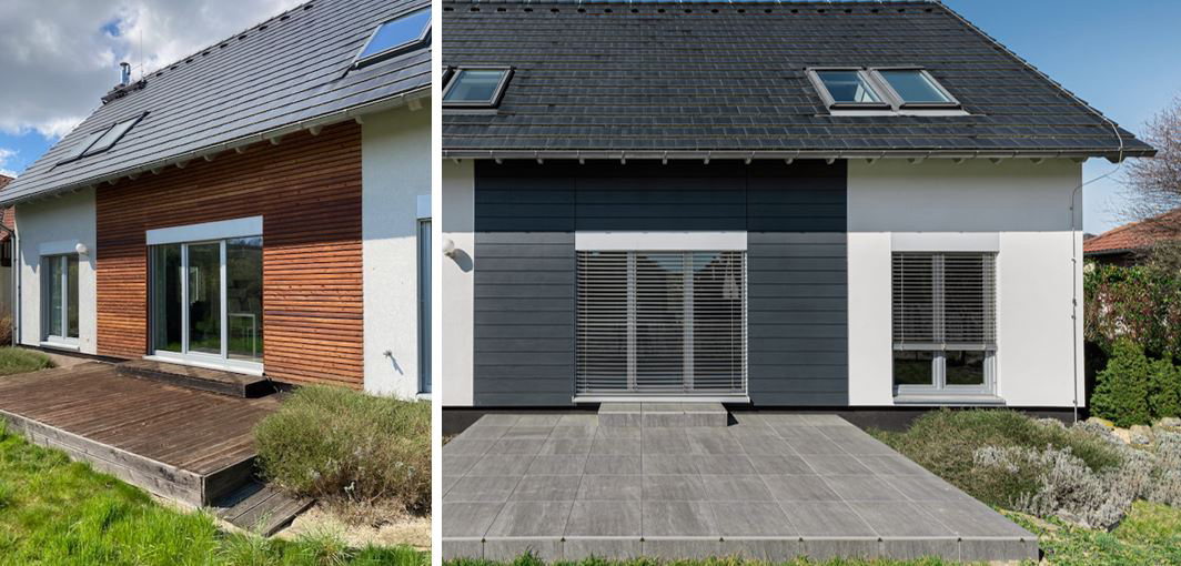 Vzorový dům společnosti RD Rýmařov v městské části Praha – Újezd nahradil nevyhovující dřevěnou fasádu vláknocementovými obklady Hardie® Panel a Hardie® Plank. Důvod pro změnu opláštění byl prostý: na rozdíl od dřeva, které postupně degraduje a deformuje, odolává vláknocement Hardie® povětrnostním vlivům.