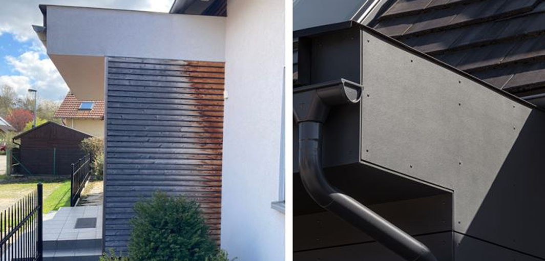 vyměnit i starší dřevěný obklad na celé ploše zádveří vstupu do domu a na části terasové strany. Vzhledem k dlouholeté spolupráci společnosti RD Rýmařov a James Hardie Europe a dobrým zkušenostem se sádrovláknitými deskami fermacell® využilo vedení vzorového domu nabídku nahradit nevyhovující dřevěný obklad