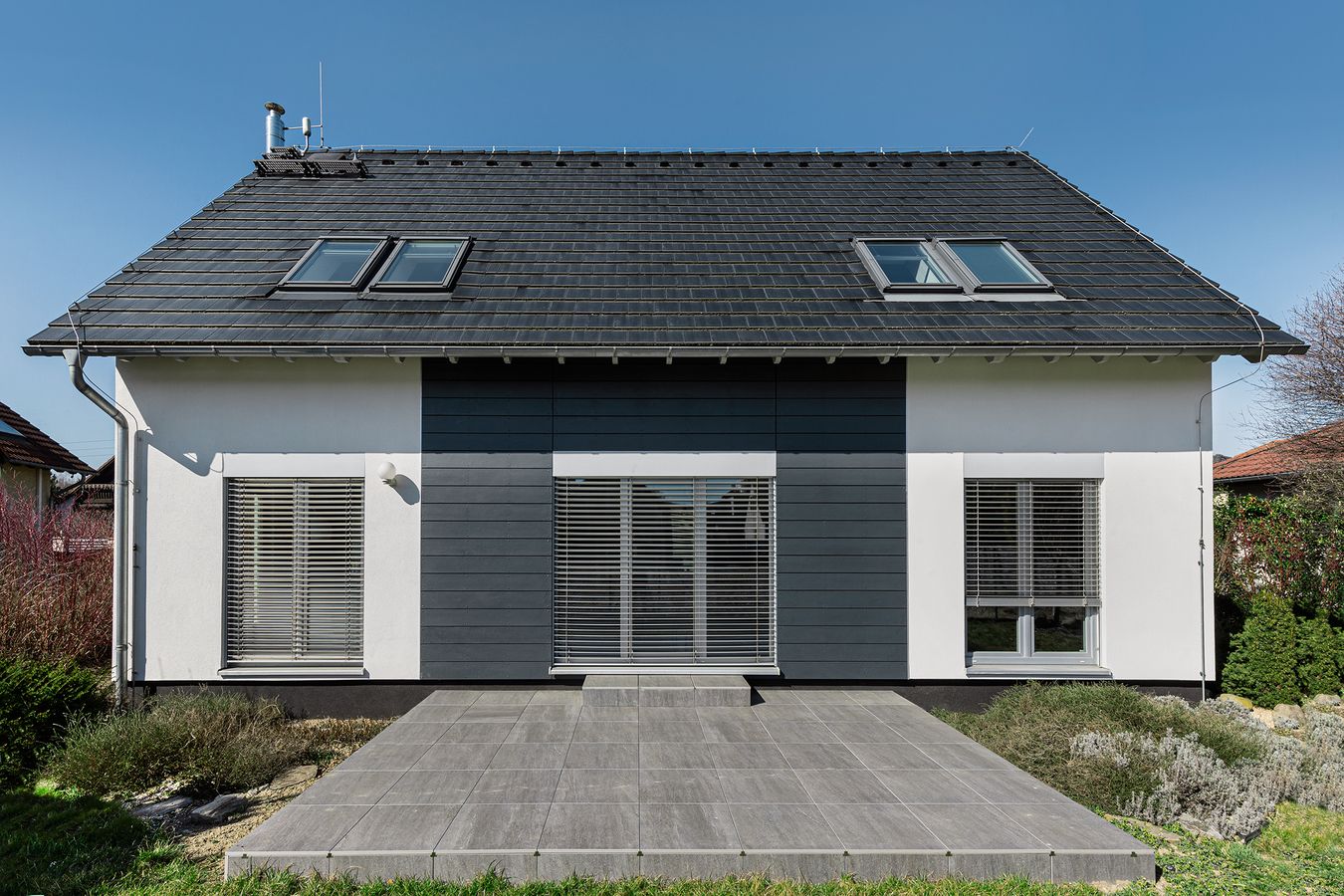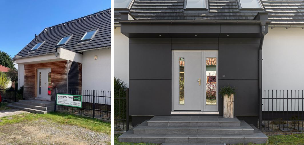 vláknocementovými obklady Hardie® Panel (obklad zádveří vstupu do vzorového domu) a Hardie® Plank (obklad stěny u terasy).