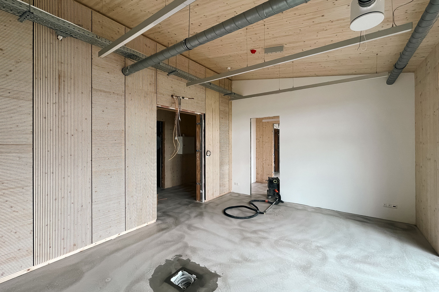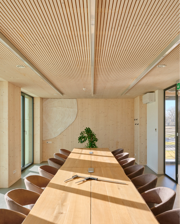 Panely z křížem lepeného dřeva jsou v interiéru maximálně přiznané, a to díky jejich výjimečné pohledové kvalitě. Horizontální části konstrukce (střecha a stropy) jsou také z CLT panelů. Dřevo v interiéru je příjemným prvkem, který zajišťuje akustickou a teplotní pohodu. Zároveň přináší estetickou kvalitu, která spolu s množstvím přirozeného světla a nábytku ve světlých tónech vytváří příjemné prostředí pracoviště.