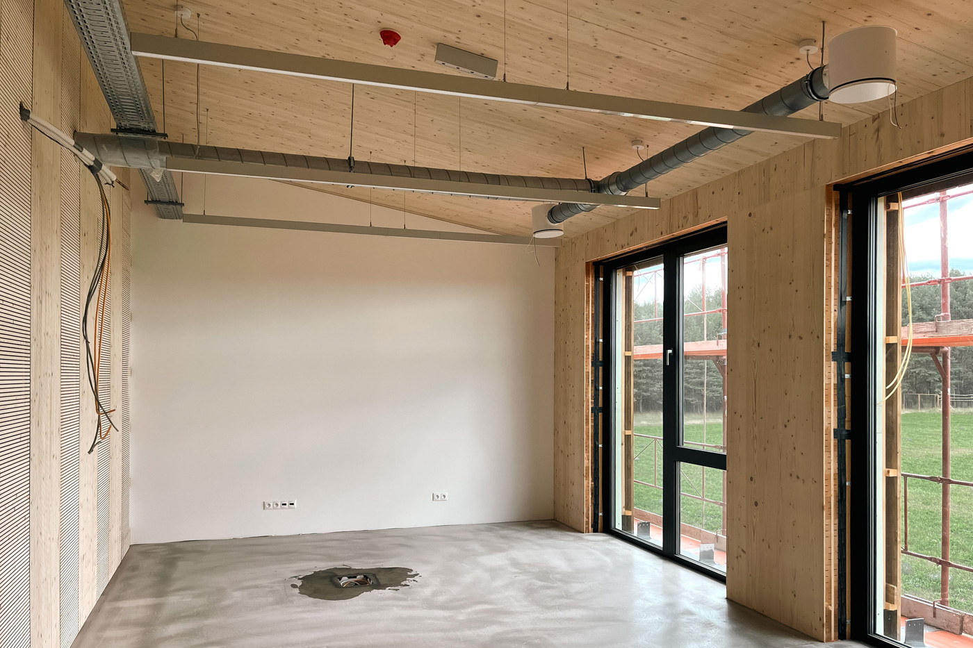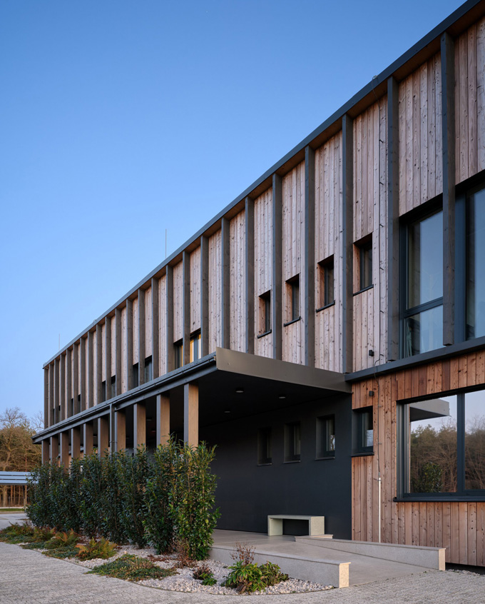 Hlavní administrativní budova je dvoupodlažní dřevostavba z CLT panelů