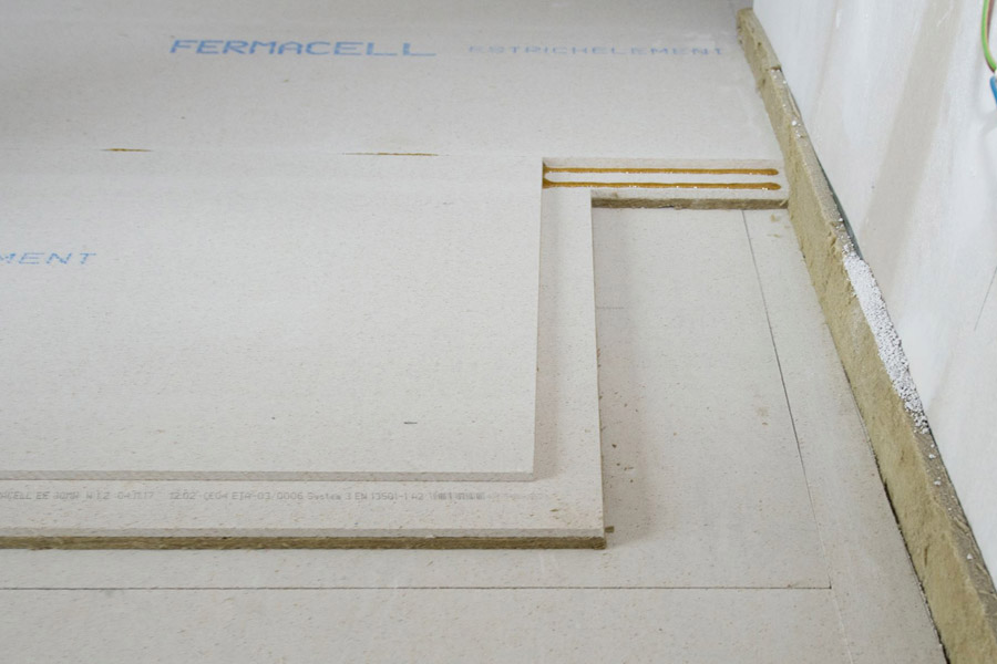 ® o tloušťce 10 nebo 12,5 mm. Desky jsou vůči sobě přesazeny tak, aby vytvořily 5 cm širokou obvodovou polodrážku, díky které je zpracování podlahových prvků ještě rychlejší. Po vytvrzení lepidla se po nich může ihned chodit, takže následné práce – například pokládka podlah – mohou rychle začít.