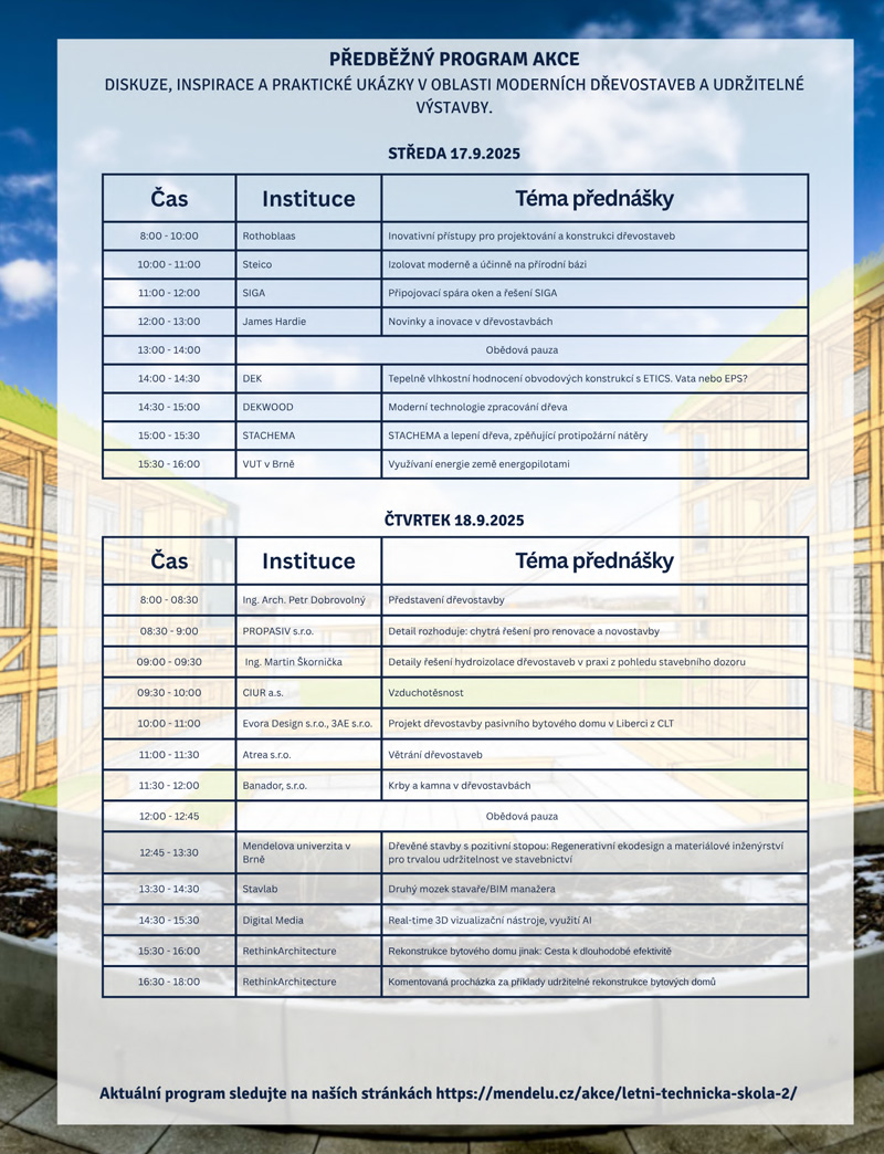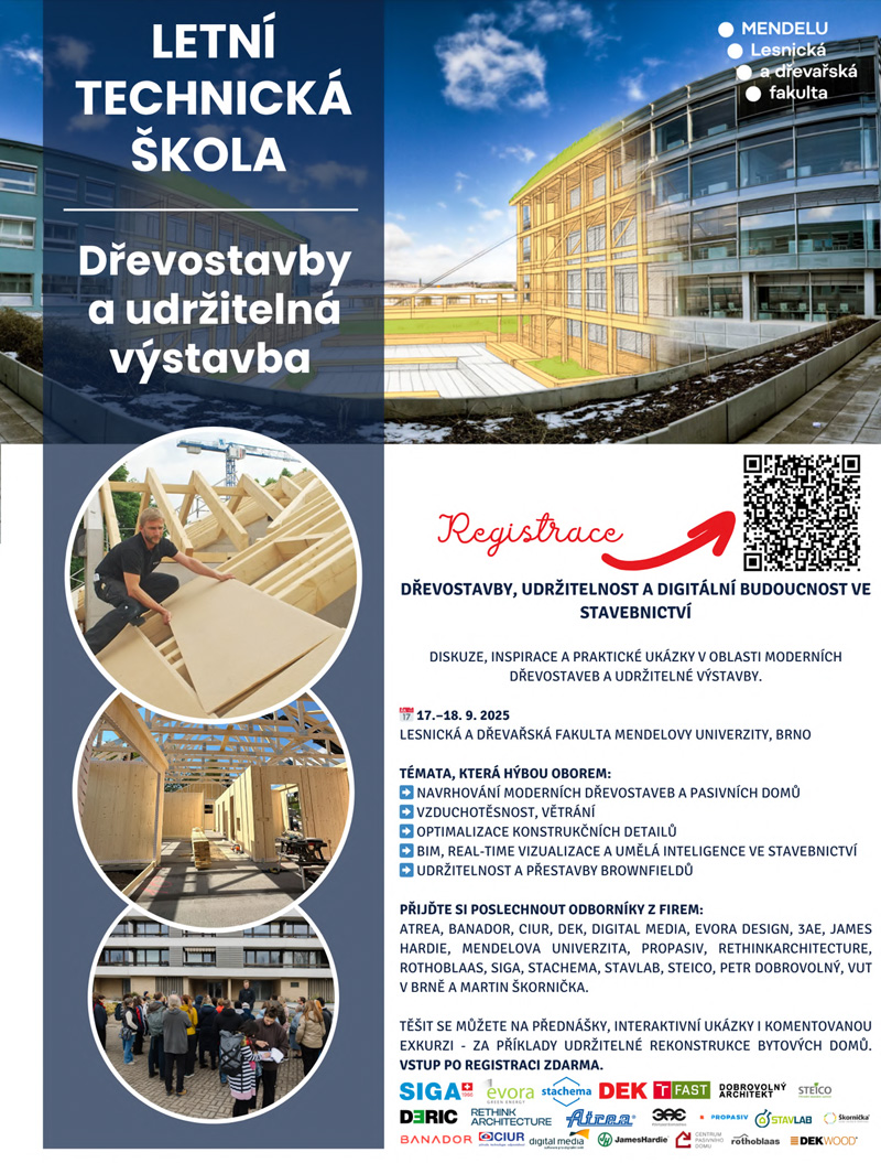 Letní technická škola bude plná prezentací předních firem z oblasti stavebního průmyslu se zaměřením na dřevostavby. Mezi tématy nebude chybět:
