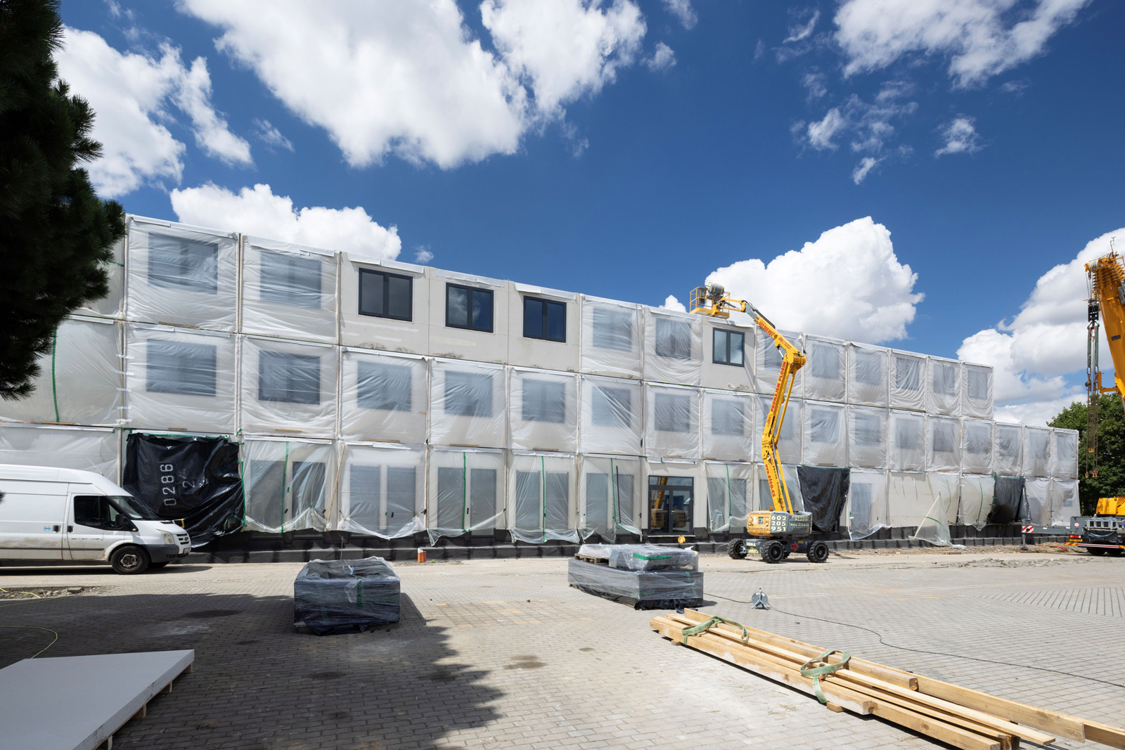 „Největší výhoda modulární výstavby není cena. Někdo se domnívá, že to bude levnější, protože je to jakási skládačka. Ne. Největší výhoda je ta, že si v teple a světle výrobní haly vyrobíte co nejvíce půjde, až 90 %. V tomto případě na staveniště přijížděly hotové pokoje vč. nábytku, na podlahách byl koberec. Koupelna obložená se sprchovými boxy, zařizovacími předměty, obložkové zárubně a zamčené dveře jednotlivých pokojů. Důležité je také to, že když vše přijede na stavbu připravené, minimálně zatěžujeme prostředí v okolí stavby staveništním ruchem. Vše probíhá již uvnitř. To je zcela nesrovnatelné s klasickou výstavbou, kde se hluku a prachu ze staveniště nevyhneme. Jen se musí myslet na logistiku. Tady v Letňanech je dopravní situace obecně složitější a naše kolona kamionů s moduly přijížděla v době koncertu AC/DC, tak to bylo hodně náročné,“ vysvětluje Karel Kolínský, obchodní ředitel KOMA MODULAR.