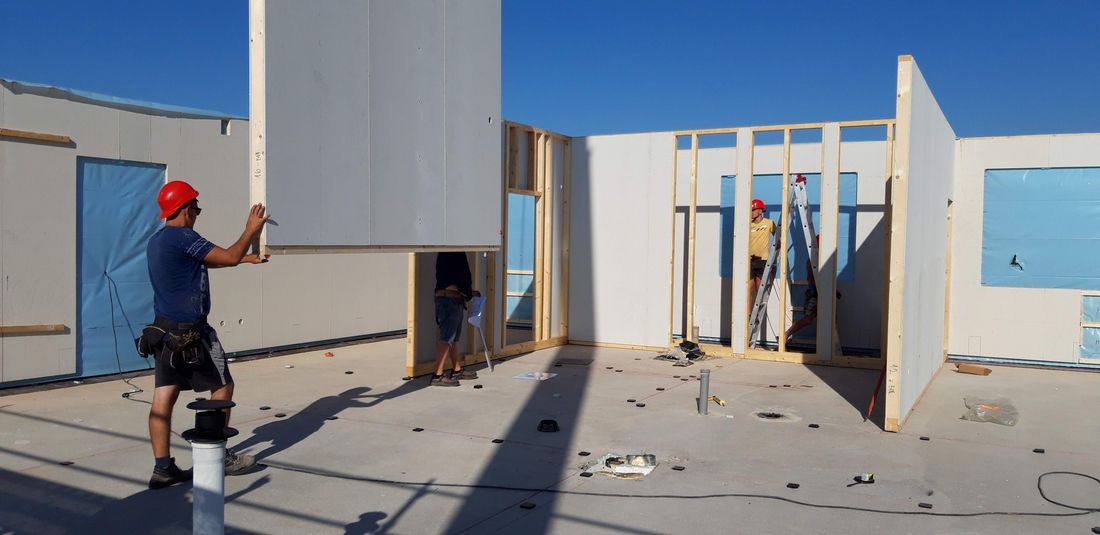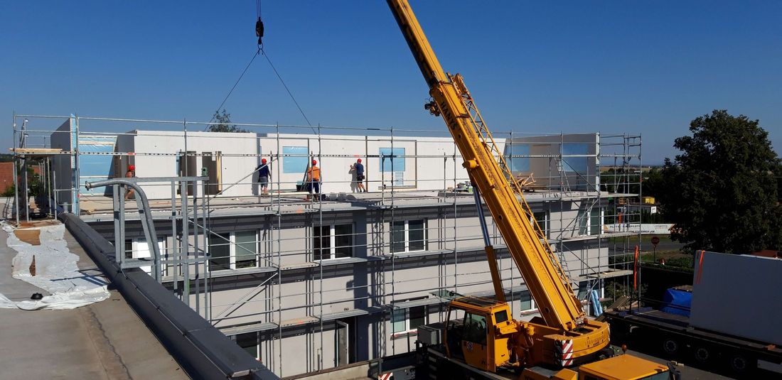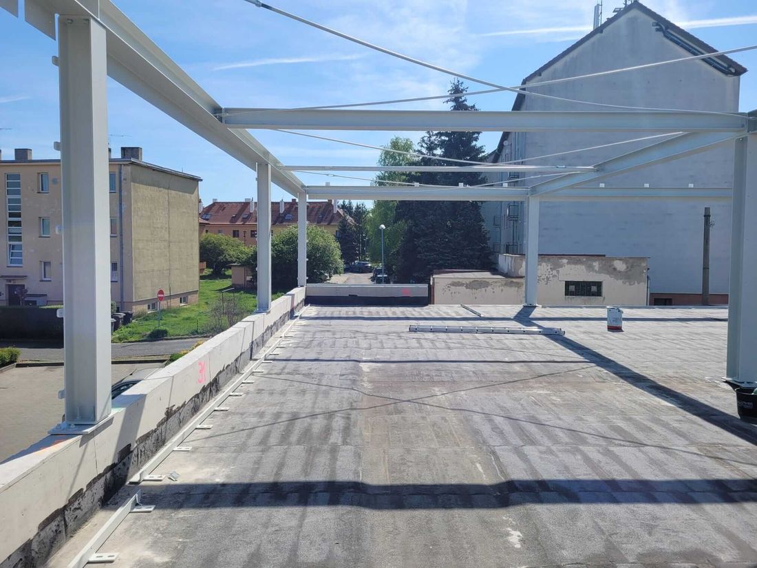 Nástavbu jsme začali realizovat počátkem května 2023 a to realizací nosné konstrukce. V polovině měsíce května jsme dvěma navazujícími etapami zrealizovali kompletní nástavbu, tzn. šest nových bytových jednotek a dalšího přípravného prostoru pro další využití v budoucnu. To všechno bylo hotovo během 4 týdnů a majitelé mohli započít s dalšími navazujícími činnostmi. Primárně jsme pro výrobu panelů používali systém suché výstavby od společnosti James Hardie Europe, konkrétně sádrovláknité desky fermacell®. S technickým oddělením firmy jsme vytipovali skladby, které dokáží splnit přísné požární i akustické požadavky, které byly projektem definovány například pro mezibytové stěny nebo únikové prostory.
