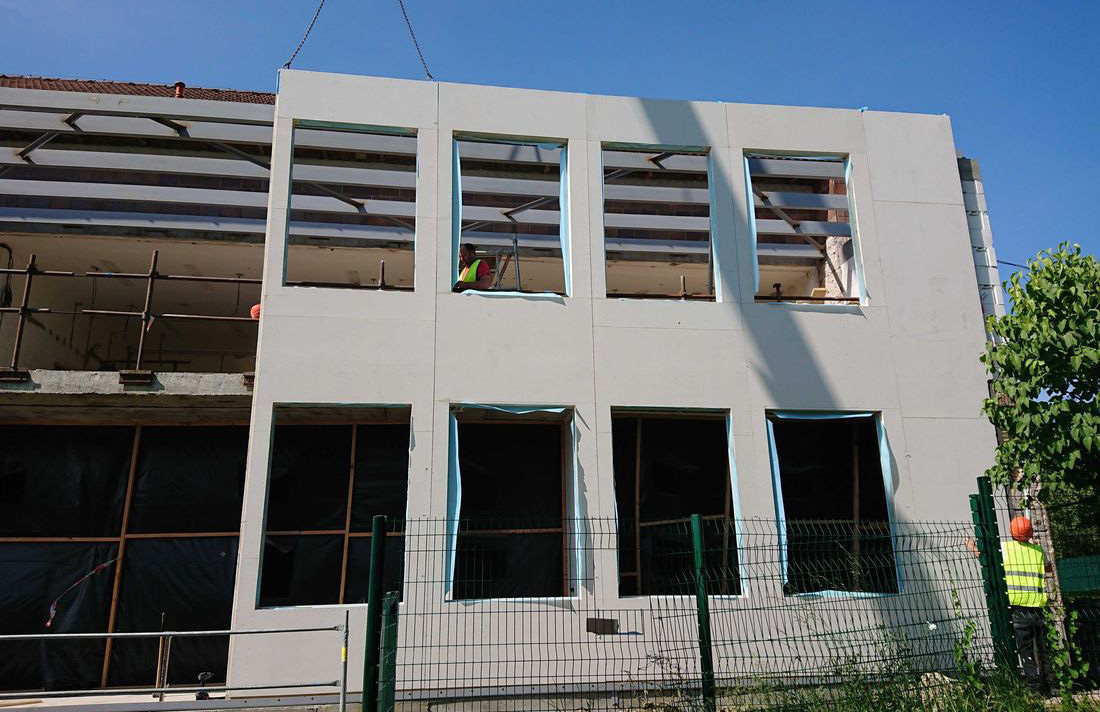 Podobný systém panelové výstavby jsme použili i pro rekonstrukci OU a MŠ Lukov ve Zlínském kraji. Tam se situace komplikovala tím, že bylo nutné z budovy nejdříve odstranit původní tzv. „Boletické panely“, které obsahují nebezpečný azbest a které tvořily obvodovou obálku budovy. Proto celá realizace probíhala za velmi přísných hygienických opatření. Současně byl výrazný termínový tlak na provedení celé rekonstrukce, a to zejména z důvodu začátku školního roku místní školky. To samozřejmě nahrávalo našim prefabrikovaným systémům, kdy jsme si výrobně mohli celou zakázku předvyrobit na dílně a na stavbě jen vyrobené a připravené panely osadit a napojit na stávající konstrukce. Na dílně jsme kompletní zaklopené panely vyráběli celkem 6 celodenních směn, kdy se jednalo o 35 samostatných panelů. Samotná instalace panelů na stavbě trvala pouze 2 pracovní dny s tím, že další 2 pracovní dny jsme prováděli již jen dokončovací práce. Pro obvodové panely jsme použili sádrovláknité desky fermacell® jak z vnitřní, tak i z vnější strany. Celkem bylo na opláštění panelů použito 770 m2 sádrovláknitých desek, což odpovídá ploše jednoho házenkářského hřiště.