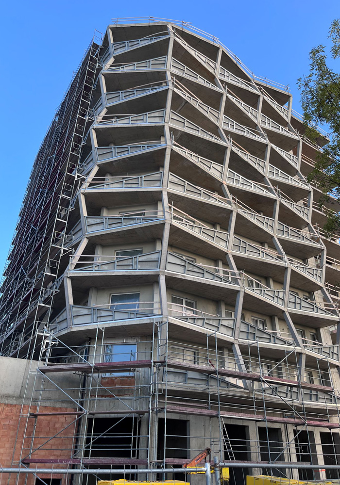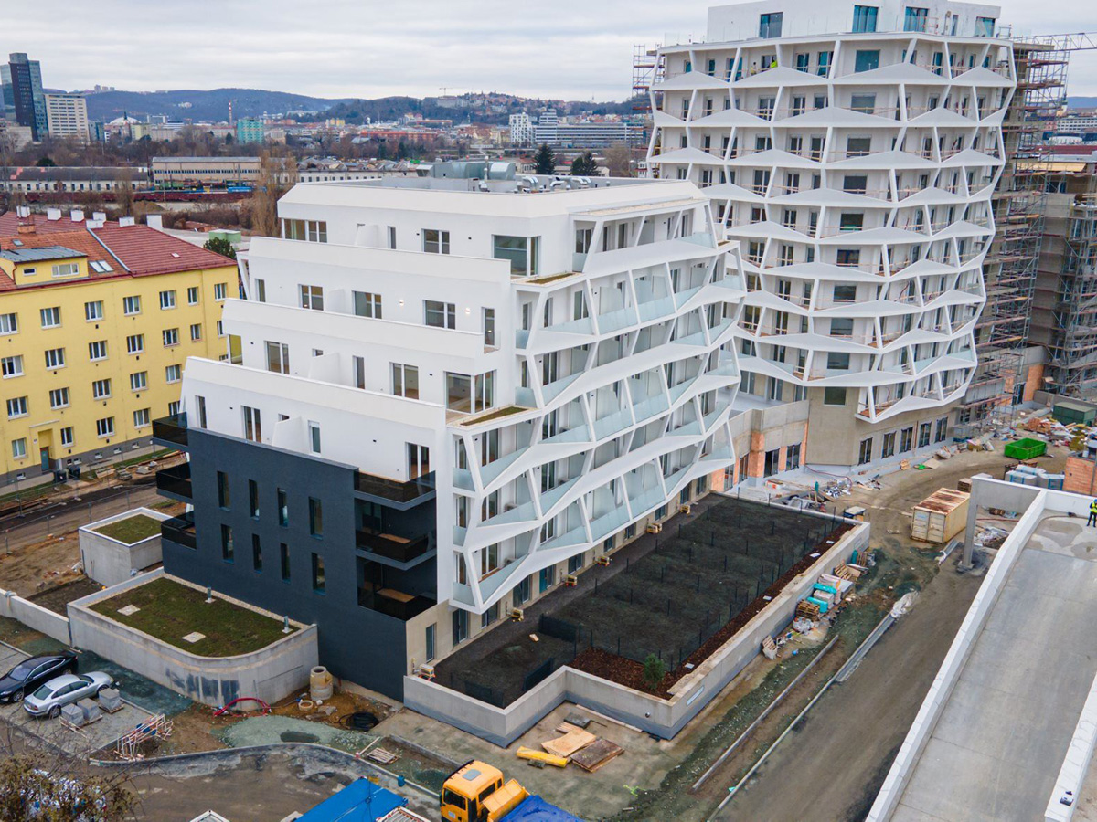 Fasáda bytového projektu AllRisk MERIDIEM v Brně zaujme na první pohled svou sněhově bílou barvou a dynamickou kompozicí balkonů, které vytvářejí dojem pohybu a lehkosti