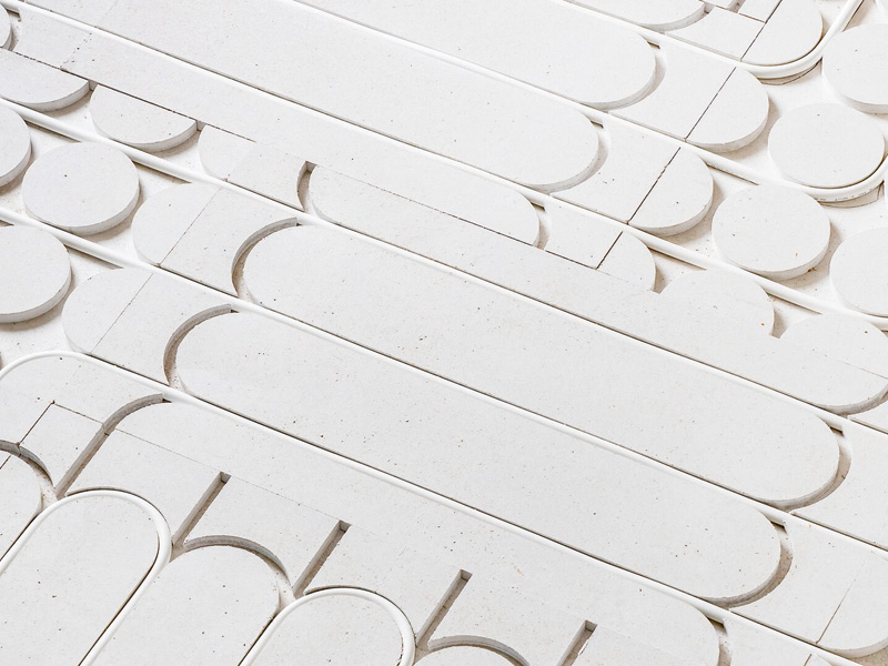 ® o tloušťce 25 mm, jejíž horní část je opatřena speciálním frézováním s průhybovými drážkami pro položení trubek podlahového vytápění. Pro speciální půdorysy nebo dveřní otvory je k dispozici také kruhový prvek fermacell