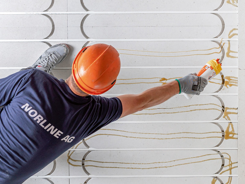 Před instalací další 10 mm silné krycí vrstvy sádrovláknitých desek fermacell® se na podlahové prvky nanese podlahové fermacell® lepidlo.