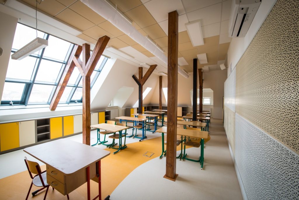 Vestavbou ve 4.NP a 5.NP vzniklo celkem pět odborných učeben, dva kabinety, sociální zařízení a komunikační zázemí plus nové schodiště. Na tomto projektu bylo použity jak systémové příčky fermacell, tak podlahy a opláštění podhledů.